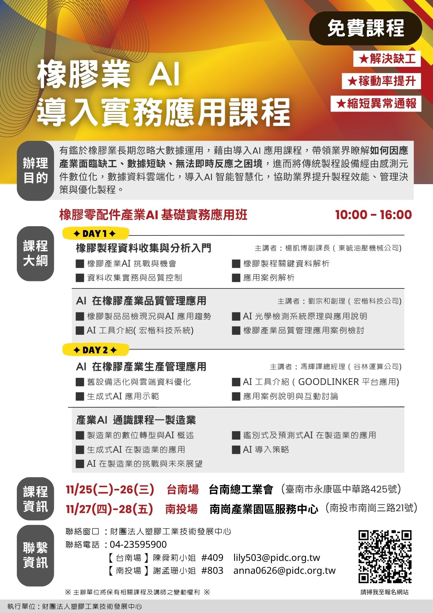 有鑑於橡膠業長期忽略大數據運用,藉由導入AI 應用課程 帶領業界瞭解如何因應產業面臨缺工、數據短缺、無法即時反應之困境 進而將傳統製程設備【經由感測元件數位化,數據資料雲端化,導入AI 智能智慧化】 協助業界提升製程效能、管理決策與優化製程。 |