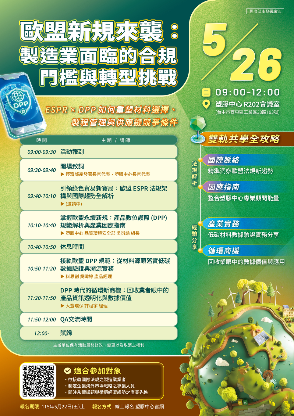 本次共學會特別邀請歐盟永續法規專家及國內外指標企業代表,針對法規脈絡、因應指南及實務案例進行深度解析。協助業者在產品身分證時代,精準掌握法規趨勢,提早佈局綠色貿易浪潮中的核心競爭力。